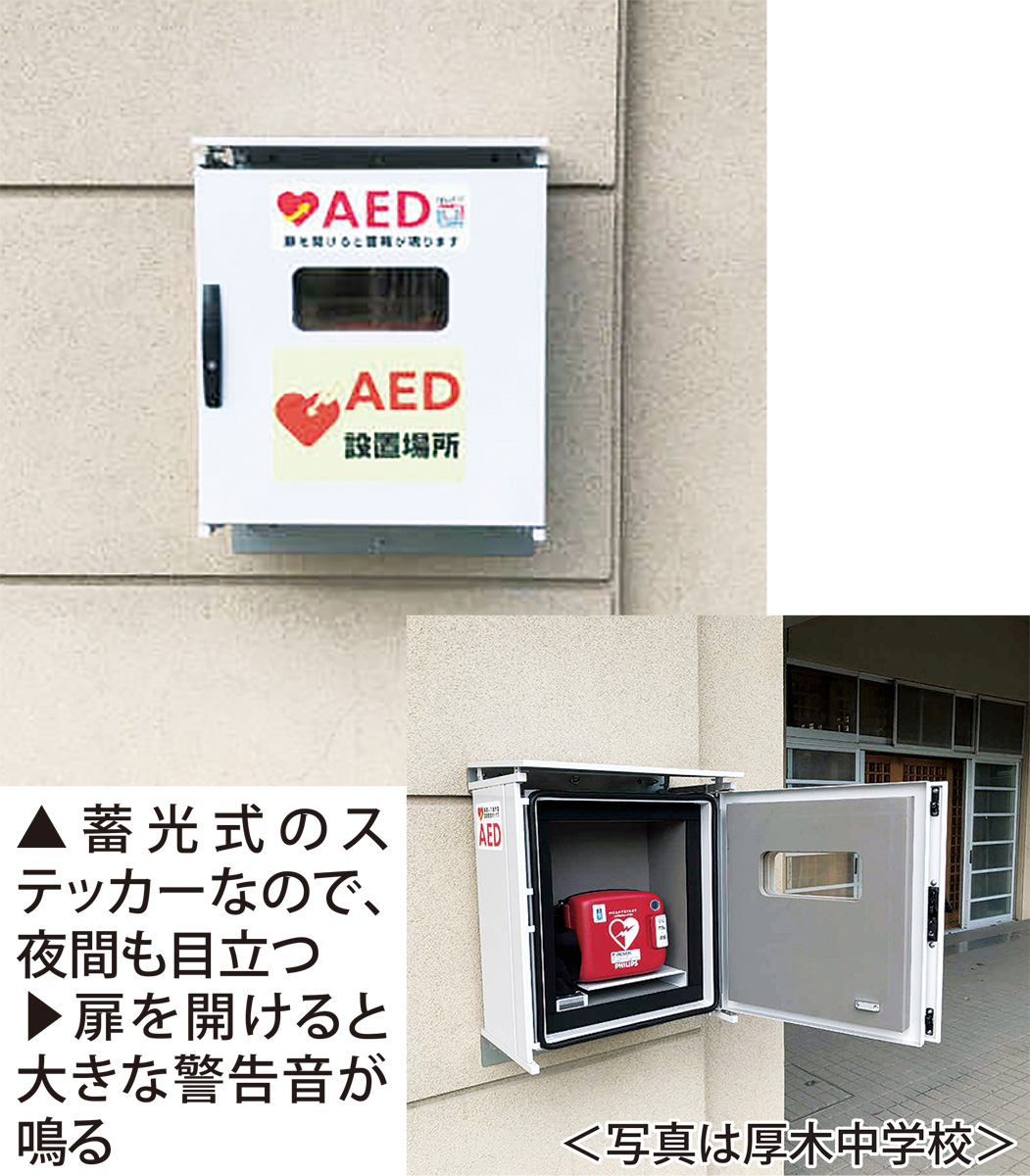 屋外活動中の児童・生徒の安心安全と、学校施設一般開放時の利用者の急病やけがに備えるため、厚木市は市立小・中学校36校すべての屋外に、自動体外式除細動器(AED)を設置した。