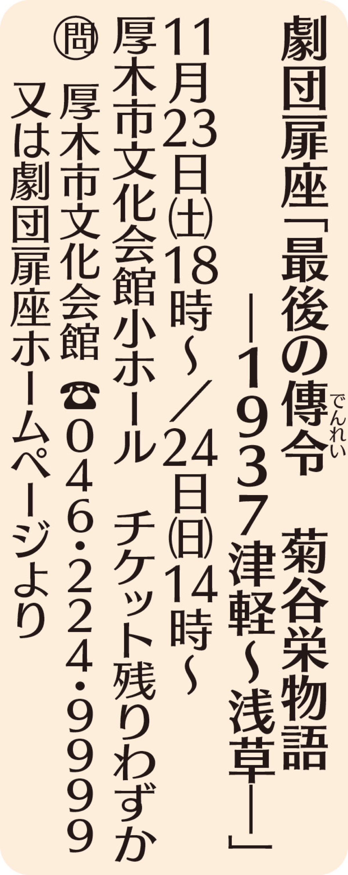 劇作家という仕事をしている。劇団活動はほぼ、お金にならないので、大きな舞台の脚本などを請け負うことで生きている。現在、新橋演舞場で上演中のスーパー歌舞伎II『オグリ』(市川猿之助主演)など。しかし作家として規模の大小は関係ない。むしろ自由に自分の世界を追求できる劇団公演用の書き下しは、40年近く大切にし続けて来た自身の存在証明である。お金にならなくても年に一本は、新作を書くことをノルマとして自分に課している。その最新作が、間もなく厚木でお披露目となる。