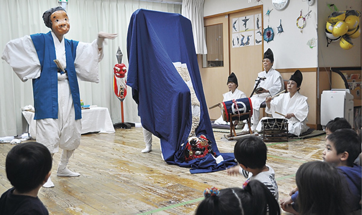 ▽現在は、入谷歌舞伎(座間)・大谷歌舞伎(海老名)で指導するほか、普及活動を行う。1月9日には厚木市寿町にあるおひさまっこ保育園(斎藤美好施設長)で公演を行った。この日は、「下り葉・幣束の舞・鈴の舞・剣の舞・狂い獅子・火男」といった演目を披露=写真下。迫力ある獅子舞に、興味津々の園児、怖がる園児など様々な反応を見せた。終演後には獅子が園児や保育士の頭を噛んで、1年の健康を祈った。