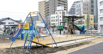 それぞれの特徴として、多目的広場は、整備前と同等の広さを確保し、イベント等でも使用できるように整備。芝生広場には築山を設置し、遊具ゾーンは幼児・児童・大人でエリア分けを行った。遊具周りは、落下や転倒時の安全性に配慮しゴムチップ舗装になる。遊具は、すべり台やブランコ、ターザンロープ、幼児遊具、健康遊具などが新しく設置され、園内にはトイレも整備された。同科の担当者は「多世代が利用できる憩いの公園になった」と話す。