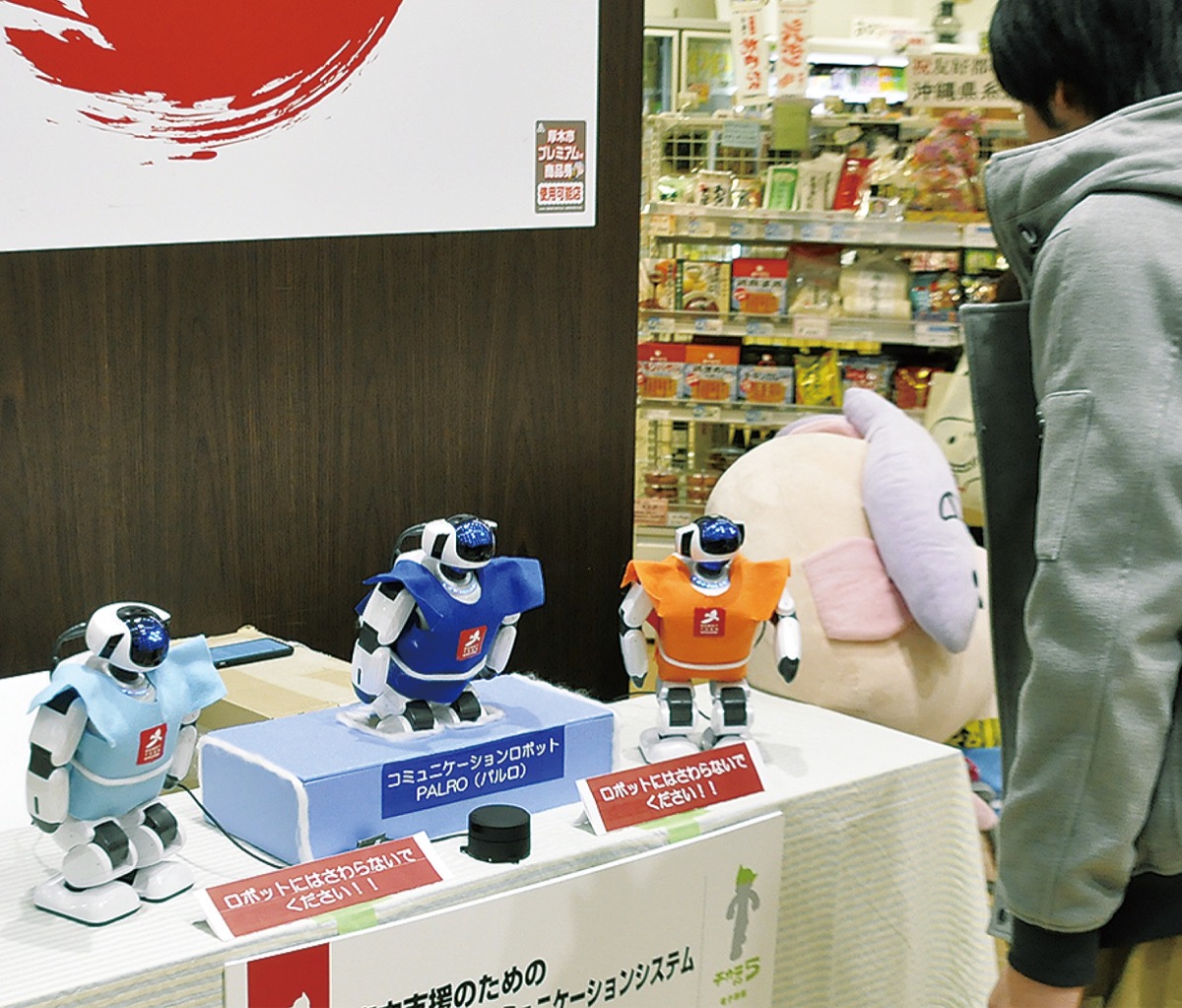これは県の公募型「ロボット実証実験支援事業」に採択された「マルチロボットコミュニケーションによる案内システム」の実証実験。昨年に引き続き行われたもので、今年は複数の会話コミュニケーションロボット「パルロ」をネットワークで連携させ、ロボットによる「声掛け+握手」と「声掛け」により、来店者のロボットに対する印象が変わるかを検証するもの。実験ではロボットが来店者に声を掛けて会話を交えて接客。来店者も興味深そうにロボットとのやり取りを楽しんでいた。