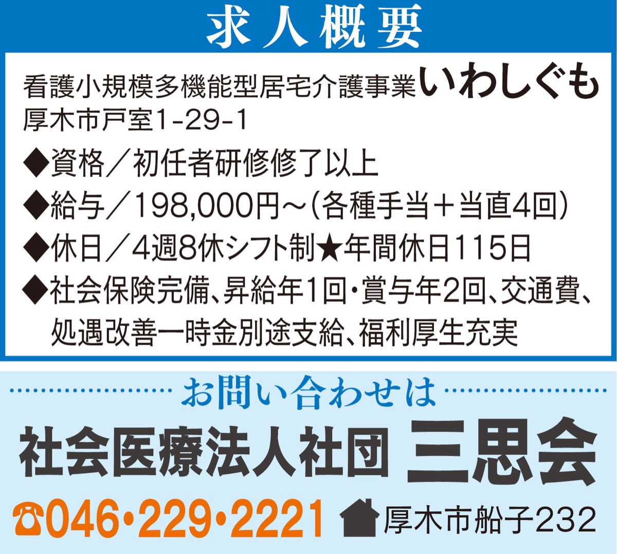 厚木市戸室の看護小規模多機能型居宅介護事業『いわしぐも』は、地域密着型サービスとして、医療と看護、介護を繋ぎ、「訪問看護」「訪問介護」「通い」「宿泊」の4つのサービスを一体的に提供。住み慣れたまちで人生の最後まで、自分らしい暮らしが続けられるよう支援する施設。職員と利用者の笑顔溢れる施設では、地域交流も活発で、地域に根付き信頼を得ている。