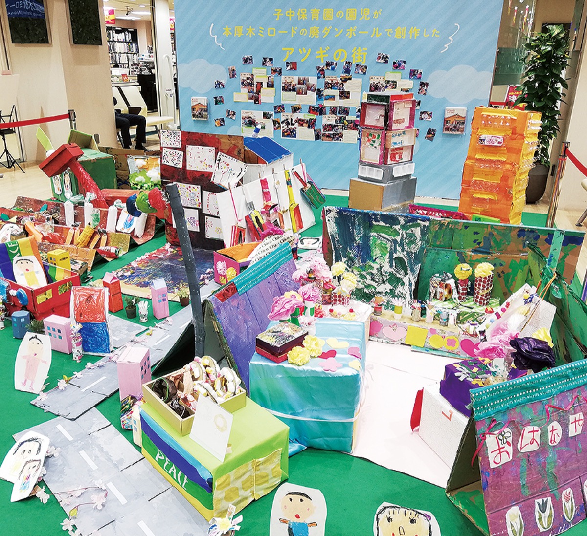 現在、本厚木ミロード【1】・4F時計台広場で、子中保育園(厚木市下荻野/大塚貴史園長)の園児が、「理想のアツギ」をテーマに制作した作品が展示されている。