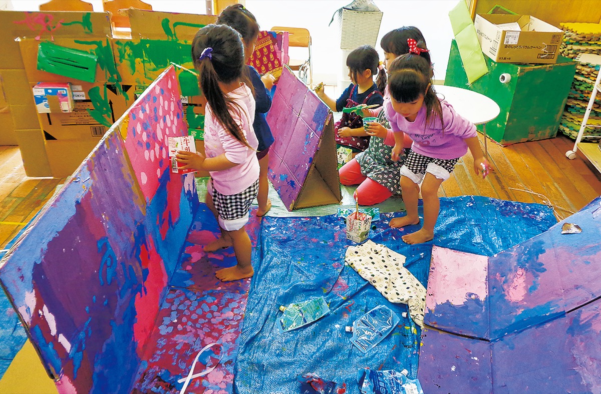 これは、ミロードから届いた廃材のダンボールや、保護者から持ち寄られた空き箱や布などを使って創作したもの。1月には、3歳児以上の園児全員で本厚木駅前を探検。生花店や楽器店などを訪れ、実際に厚木の街に触れることで、想像力を膨らませた。それから、街探検の振り返りを行い、制作スタート。ダンボールを貼り合わせたりペイントしたりしながら、探検で観察したものを中心に制作した。