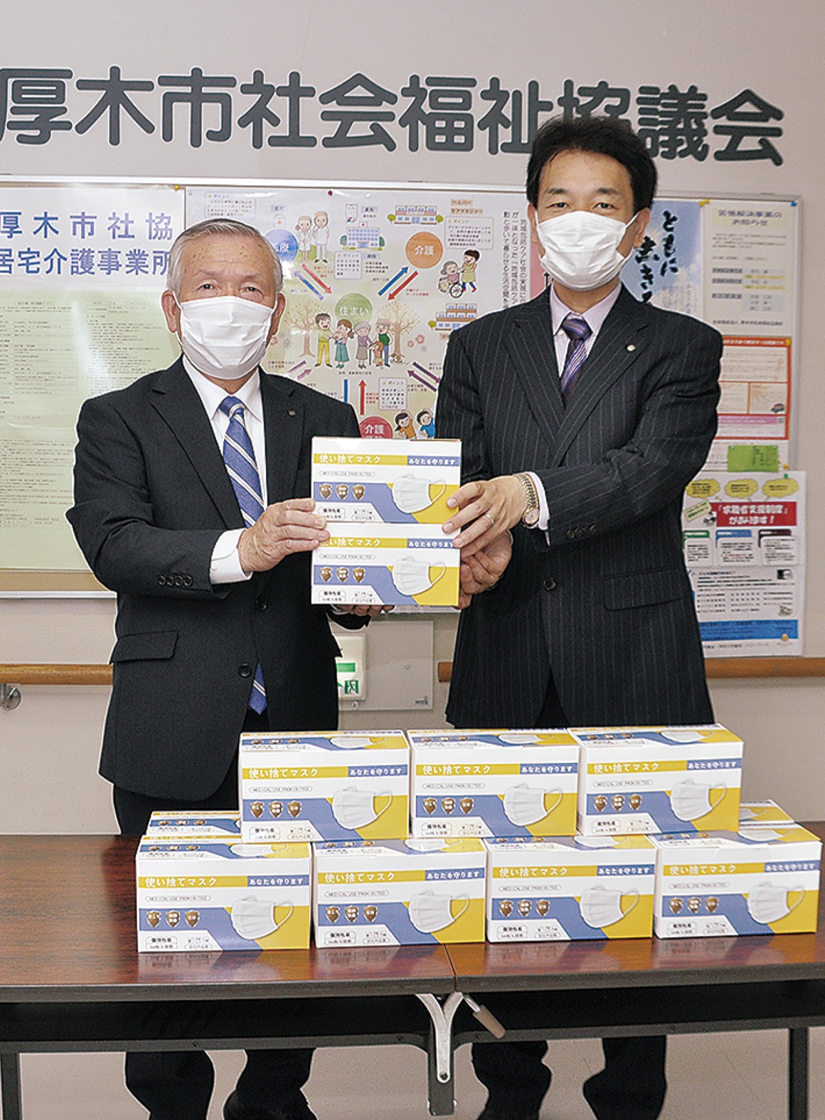 一般社団法人あつぎ相続くらし支援センター(前島憲司代表理事)は6月4日、市社協に、使い捨てマスク3千枚を寄付した。
