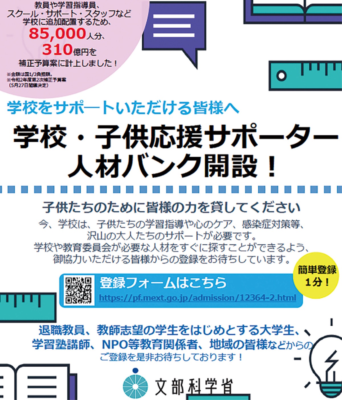 文部科学省でも同様の「学校・子供応援サポーター人材バンク」を開設。学校や教育委員会が必要な人材をすぐに探すことができるよう、登録者を受け付けている。対象は退職教員、教師志望の学生をはじめとする大学生、学習塾講師、NPO等教育関係者、地域の人たちなど。