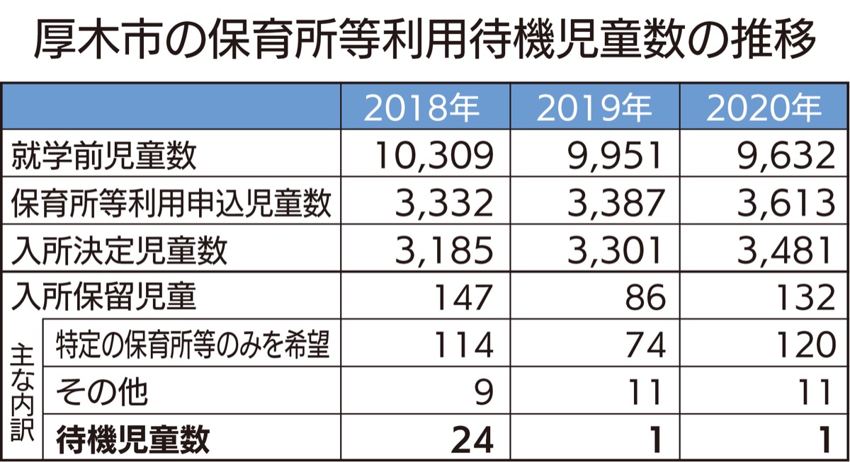 厚木市の発表によると、4月1日時点での就学前児童数は9632人で過去最少。一方で、利用申込児童数は3613人(前年比226人増)で過去最多となった。そのうち入所決定児童数は3481人(同180人増)、希望の保育所などに入所できず保留となった児童は132人(同46人増)だった。