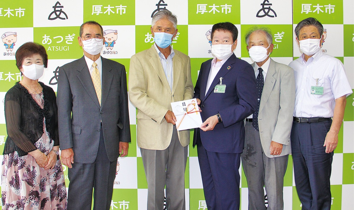 厚木市グラウンド・ゴルフ協会(横沢義雄会長)は6月22日、厚木市役所を訪れ、スポーツ振興を願い協会員で集めた寄付金5万円を小林常良市長に手渡した=写真。