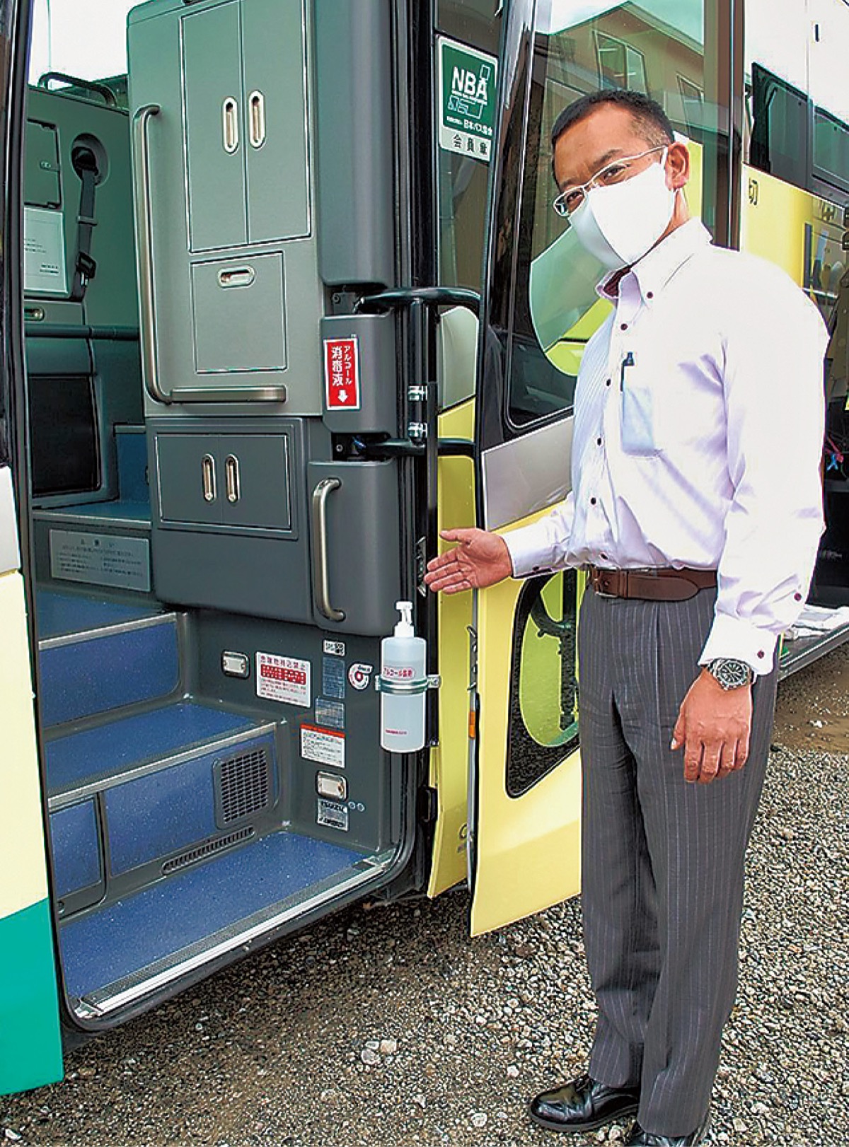そんななか、乗務員らが中心となって手作業で消毒液やパネルを設置。乗降口に設置する消毒液はやや低めに設定し、子どもや小柄な女性でも利用しやすく工夫した。また、座席や運転席に付けられたアクリルのパネルも素材から手作りすることで、大幅にコストを削減することができたという。これらに加え、実際の運行では感染症対策のガイドラインに沿って消毒や換気も行う。同社の小島貴代表取締役は「感染症対策は、これからのバスのスタンダードになっていくはず。お客様の不安を少しでも無くしていきたい」と話す。
