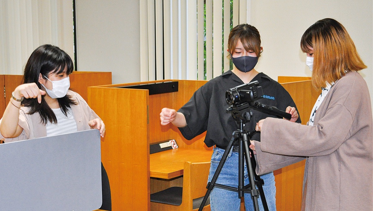 現在、学生のバイト登録人数は220人ほど。オンライン授業のサポートや学生相談のサポート、大学のパンフレットを読んで意見をまとめる仕事など、さまざまな内容のアルバイトを募集している。そんな中、大学のPR動画制作のアルバイトをしている学生がいる。情報学部情報メディア学科3年の吉田明美花さん、末次花佳さん、齊藤綾香さんの3人だ。