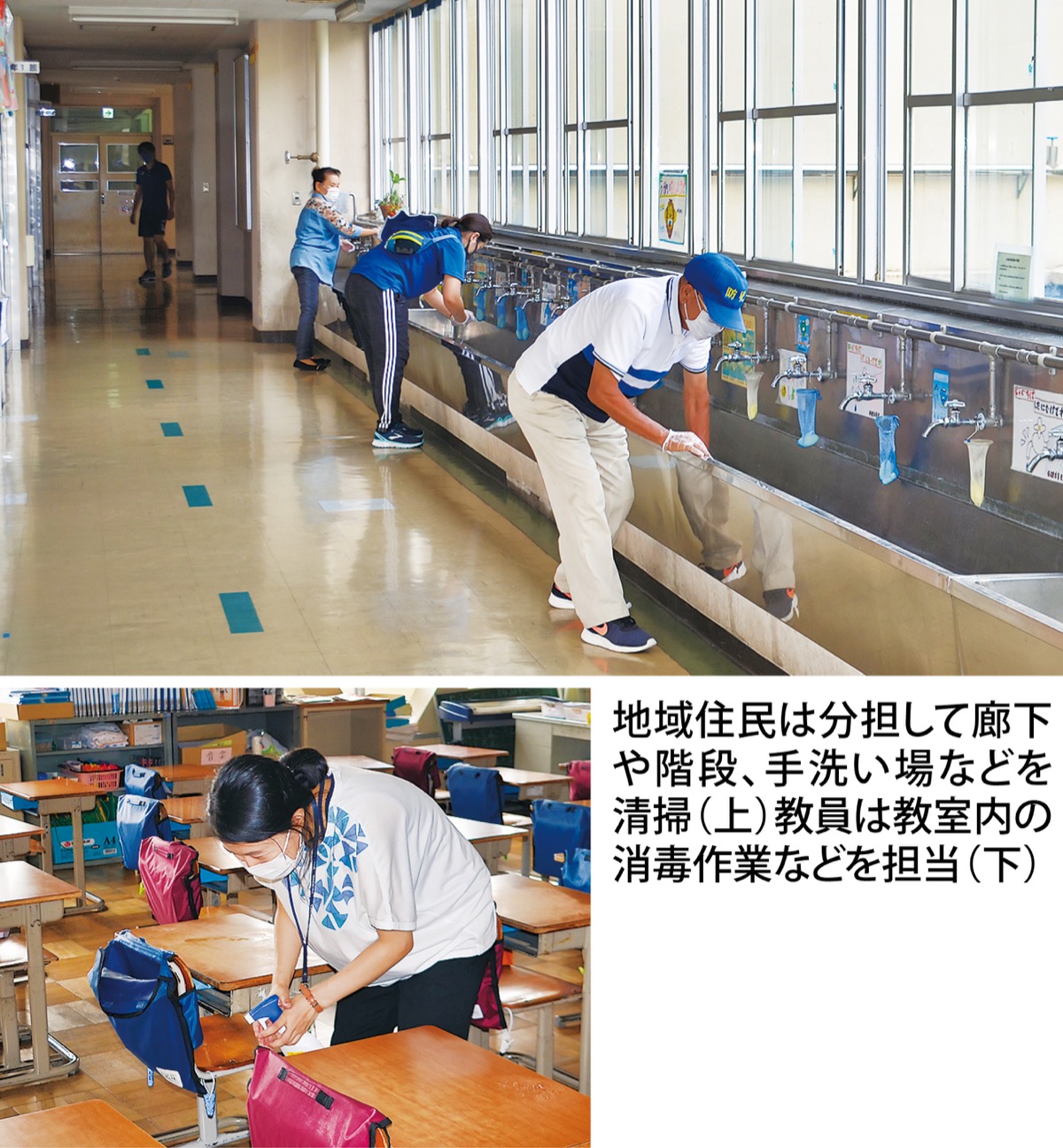 24日から始まった作業では、全児童が帰った午後3時に担当の住民が来校。玄関や各階の廊下、階段、手洗い場を清掃する一方、教員が教室内の清掃・消毒作業を行うという役割分担で行われている。作業は30分程度で終了できるとし、教員の負担がだいぶ軽減されているという。