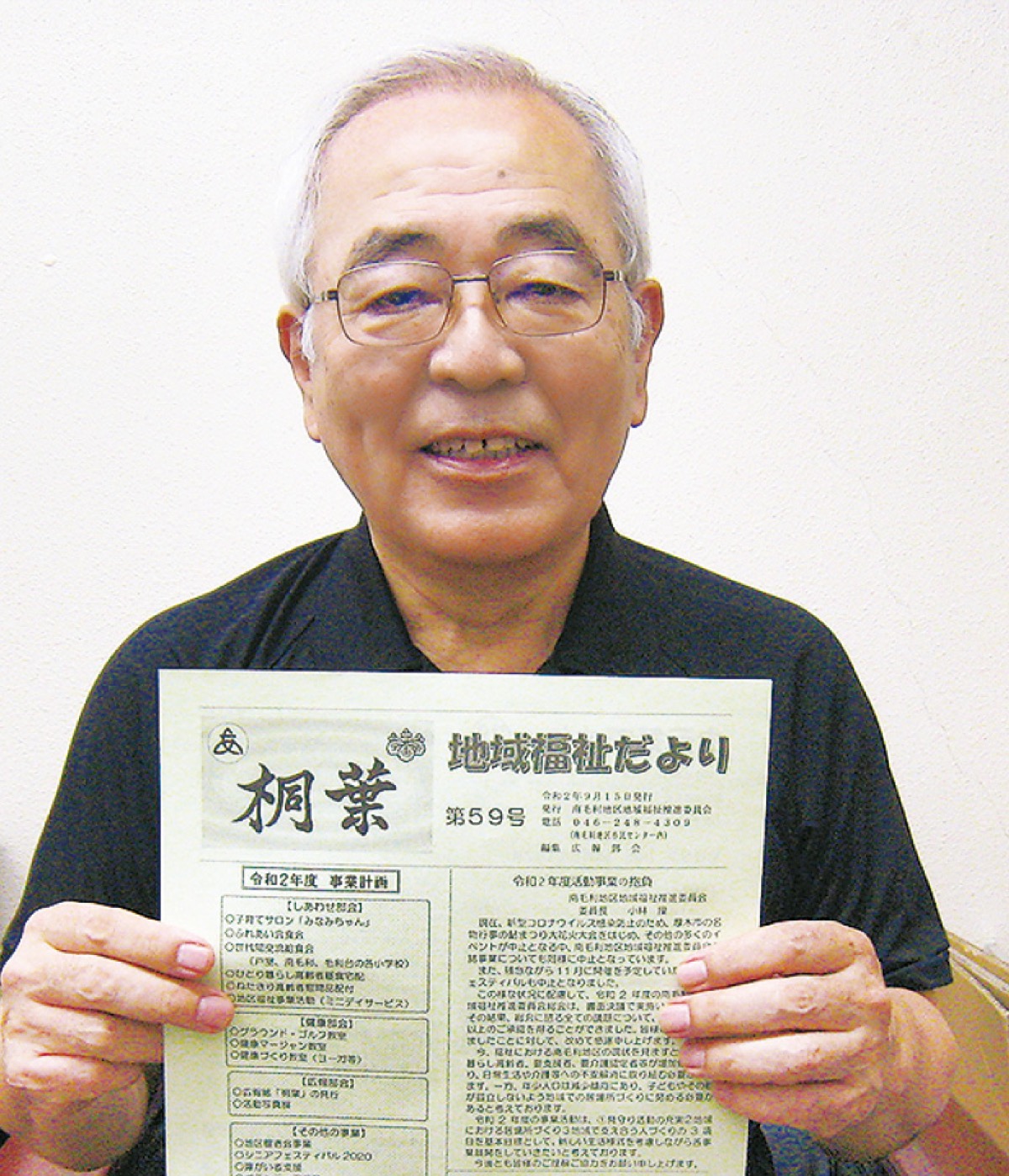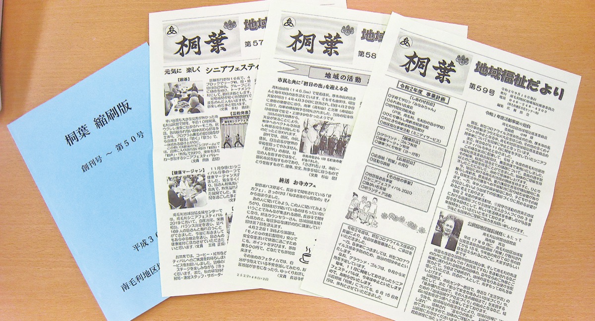 ▽南毛利地区地域福祉推進委員会の広報部会が発行している地域福祉だより『桐葉』は、2005年9月15日に創刊。以来、15年にわたり年4回、地域住民に福祉情報を発信し続けている。18年3月15日には節目の第50号を発行。同年5月にそれまでの全号を編纂した冊子『桐葉縮刷版 創刊号〜第50号』も発行した。本来なら今月15日の発行号が60号になるはずだったが、新型コロナウイルスの影響で活動を自粛したため、今年6月の発行を止めたため、節目の号は12月に持ち越しとなった。「これまで多くの人が編集に携わって続いてきた。その人たちみんなに感謝です」と、現在の委員長の小林操さんは話す。