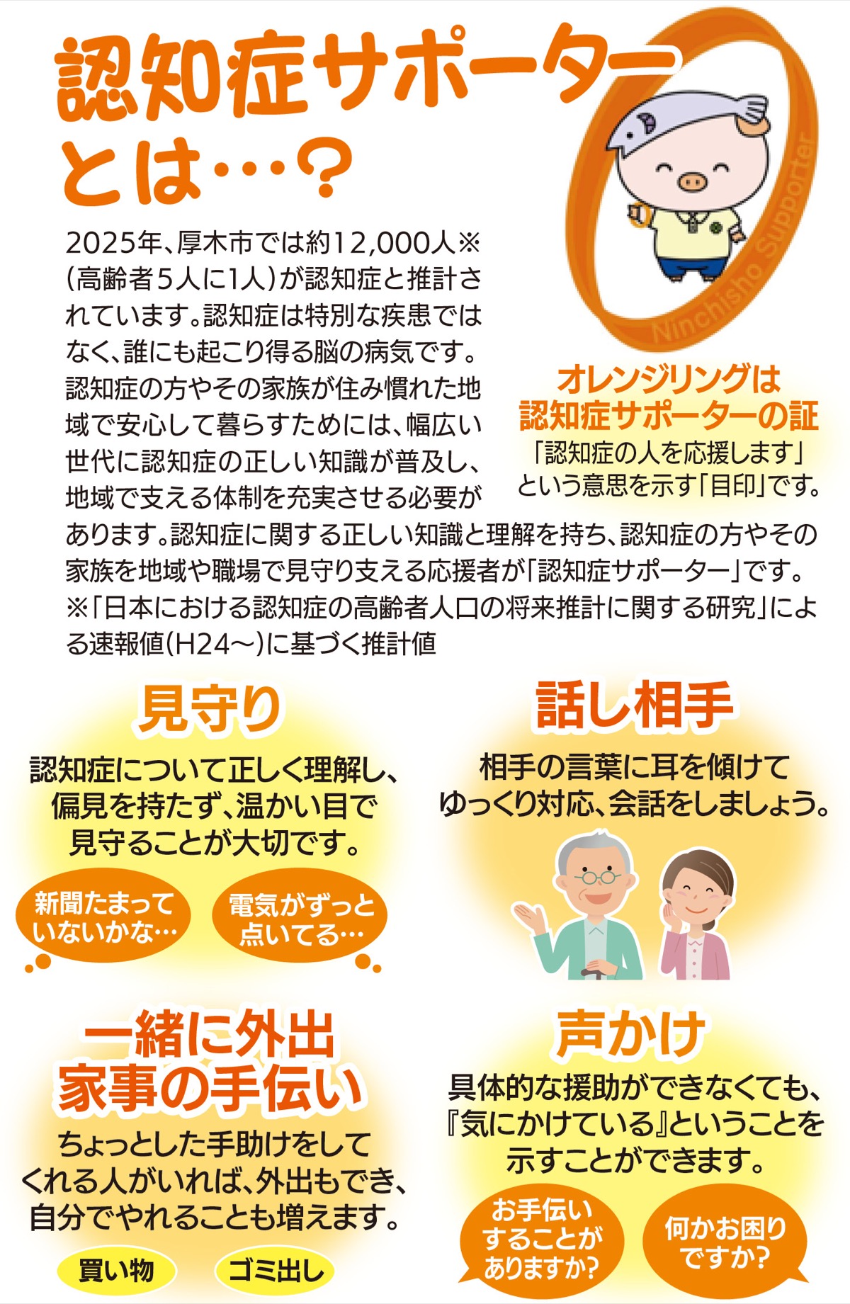 午後の部は、映画上映会とサポーター養成講座が行われる。映画はあつぎのえいがかんkikiで、認知症映画「ケアニン〜こころに咲く花〜認知症になってもその愛だけは僕が消させない」を上映。先着50人(要申込み)。認知症サポーター養成講座は、厚木中央図書館3階視聴覚ホールで開催。先着45人(要申込み)。時間は午後1時30分から3時(映画は3時30分まで)。無料。