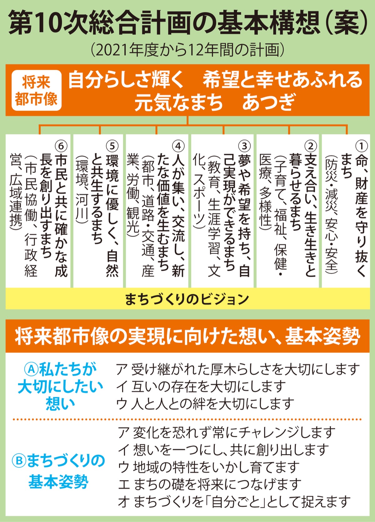 総合計画とは、将来の市の姿と進むべき方向を明確にする長期的な計画。行政運営の指針となる最上位の計画となる。今年度は、09年に策定された第9次総合計画(あつぎ元気プラン)の最終年度で、第10次総合計画は21年度から12年間の計画となる。