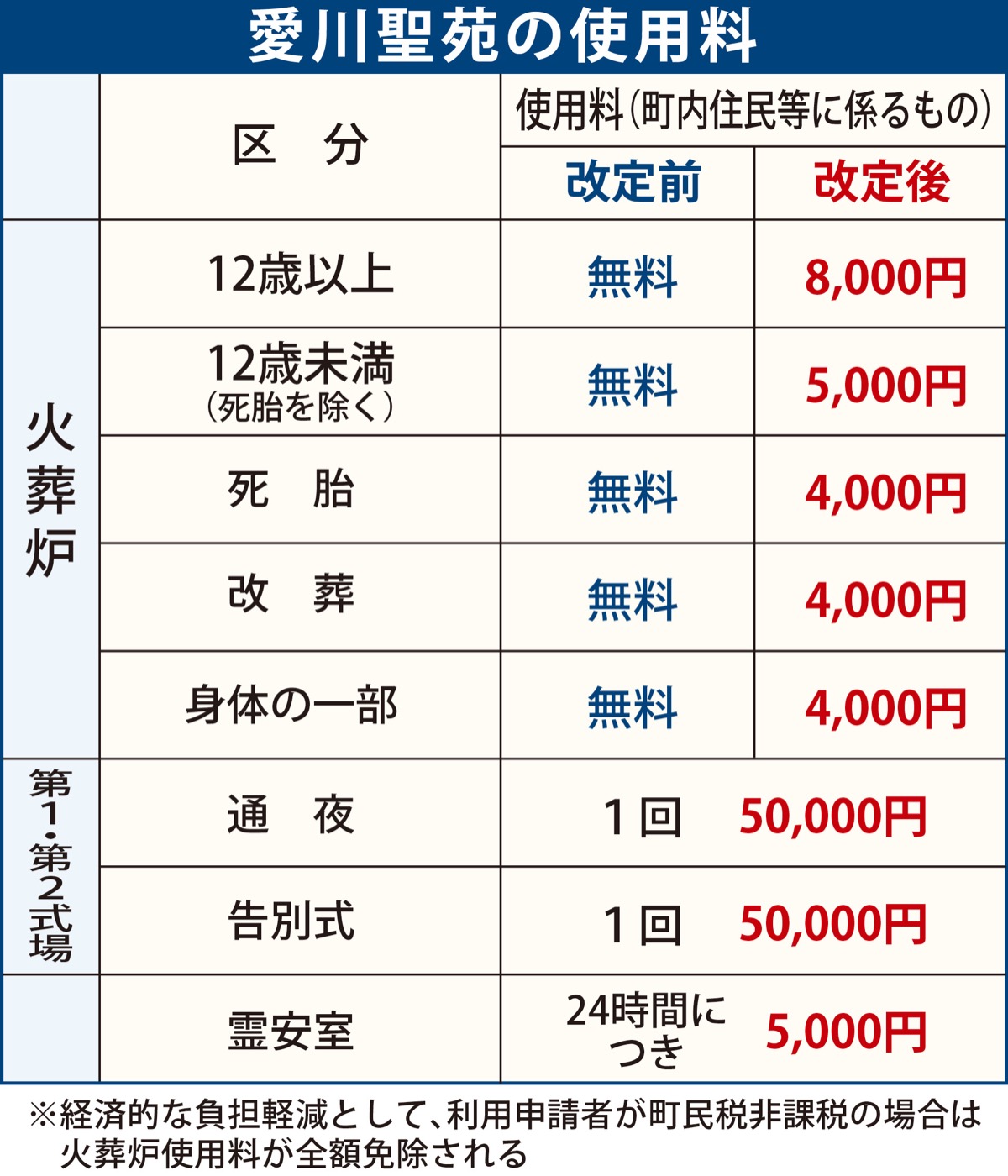 10月1日の改定後は、従来から町外在住者に設定している火葬炉使用料の10分の1相当を負担することになり、12歳以上が8千円(町外在住者8万円)、12歳未満が5千円(同5万円)など。通夜や告別式での式場使用料や、霊安室使用料等は変わらない。