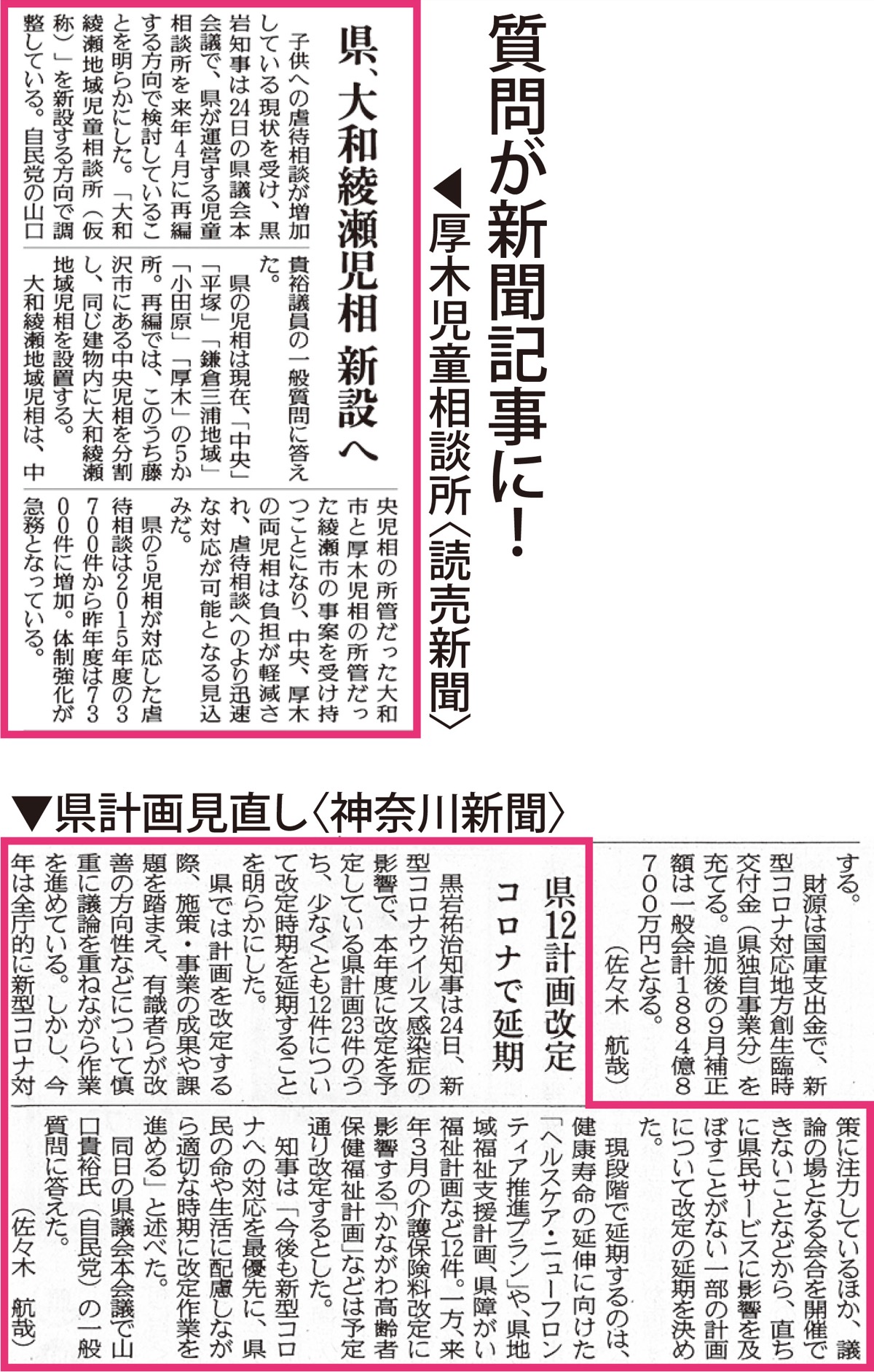 質問では地域の最重要課題で私が長年取り組んだ厚木児童相談所の移転新築、そして児童相談所としてきめ細かい相談対応をするための『適正規模化』を検討し厚木児相の『所管区域の見直しの必要性』を強く説きました。知事からは令和4年4月に厚木児童相談所を新しく開所することと、厚木児相の所管区域であった綾瀬市を新設する大和・綾瀬地域児童相談所に移管するとの答弁がありました。