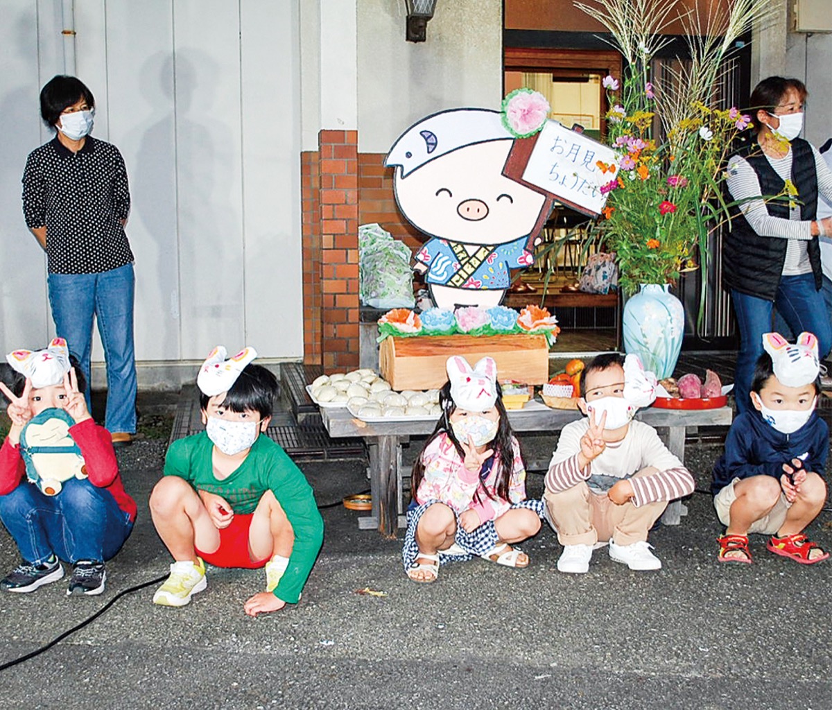 例年であれば、子どもたちが大人たち手作りのうさぎの面を付け、列をなして地域の家庭を訪問。玄関や庭先にススキ飾りがある家の前で「お月見ちょうだい」とおねだりし、家人からお菓子などが振る舞われる。しかし今年はコロナ禍のため、猿ヶ島自治会館にススキやお饅頭、野菜などをお供えし、子どもたちに集まってもらい、袋いっぱいのお菓子などを配った。
