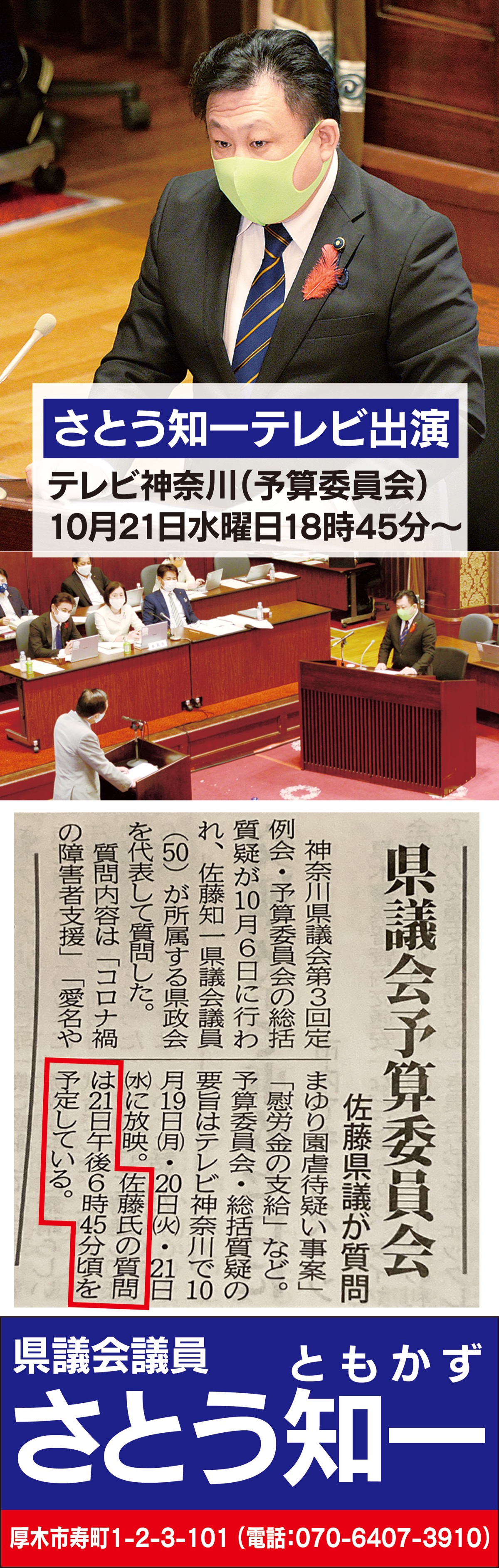 予算委員会(総括質疑)は、10月21日(水)、18時30分から19時55分の放送予定(テレビ神奈川)です。