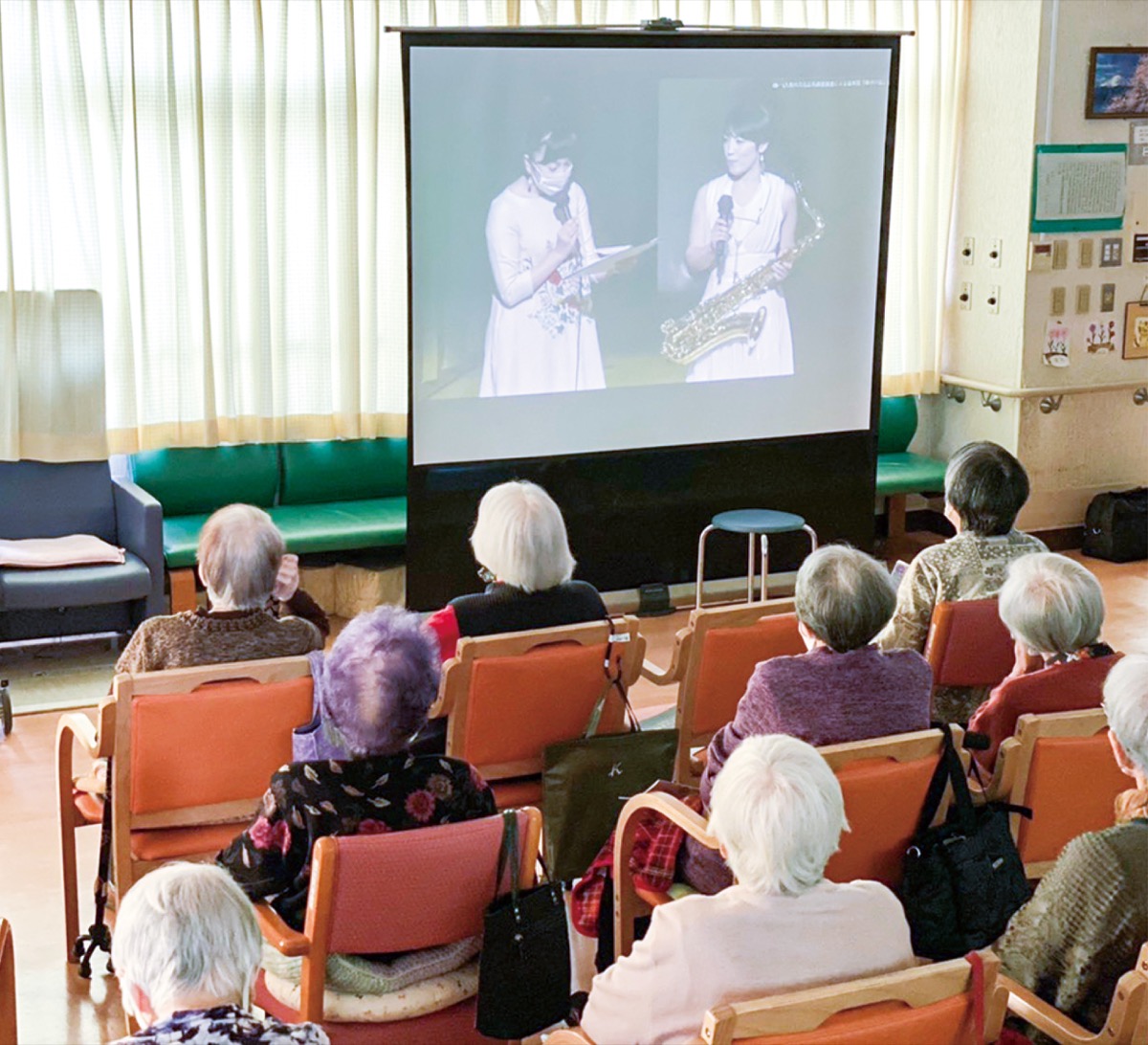 新型コロナウイルス感染症の影響で、特に高齢者は会場でのコンサートの鑑賞が難しいなか、当日は施設入居者らがスクリーンの前に集まり、コンサートを楽しんだ。同法人では、「みなさんがご存じの曲は口ずさまれたりして楽しまれていた。コロナ禍で外出もままならないなかで、リアルタイムでコンサートを楽しめて良かった」と感想を話した。