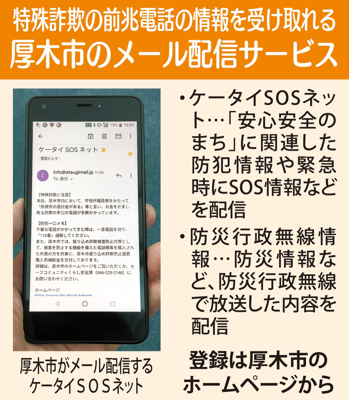 11月10日、厚木市内において、息子や親族をかたるオレオレ詐欺の電話が多数かかってきました。