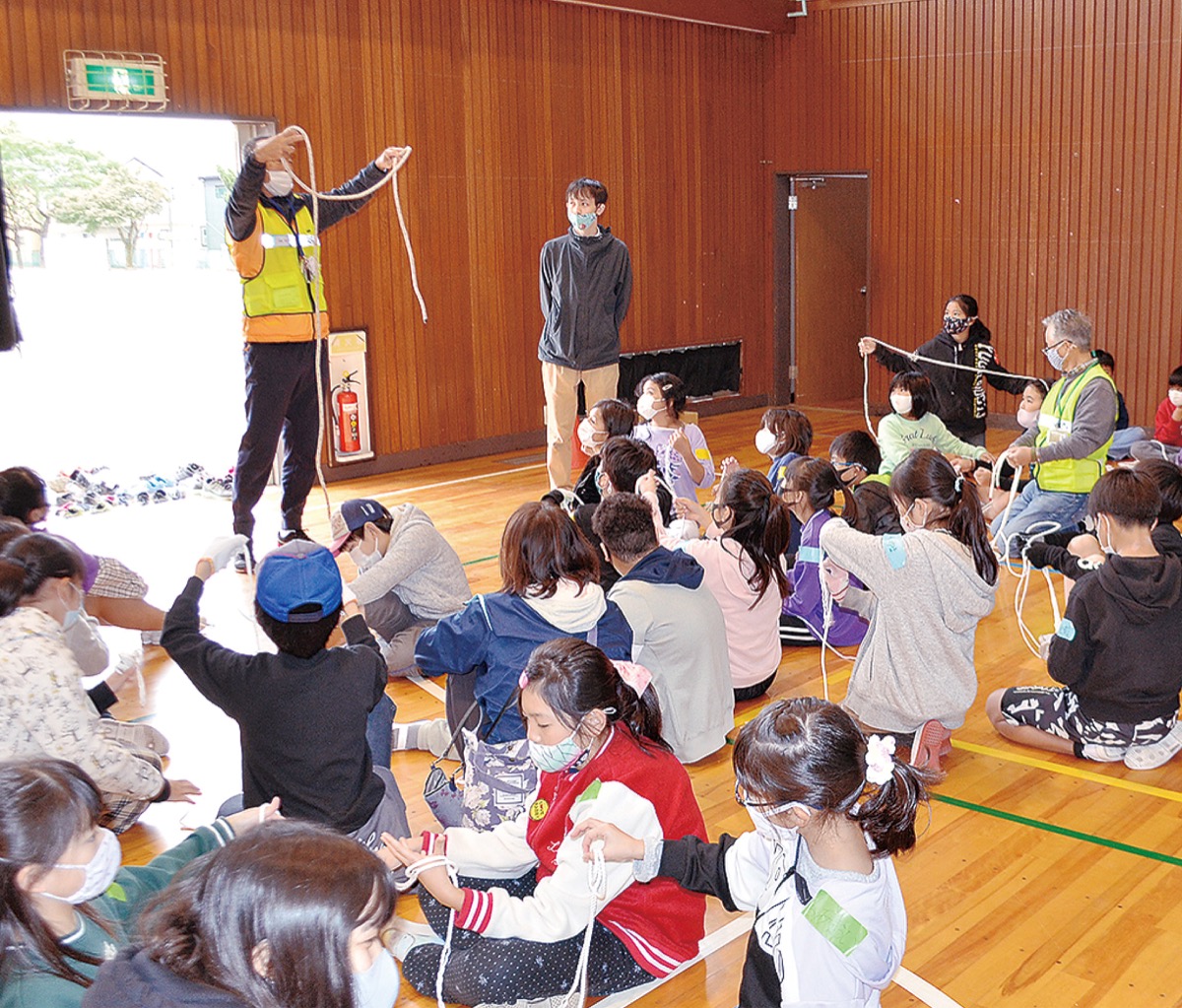 この日は、あいかわ町災害ボランティアネットワークや町消防団員などが講師役として参加。児童らは体育館や校庭で、段ボールを使ったプライベートエリアづくり、バケツリレー、ロープワーク、応急手当などを体験した。防災食のアルファ米とライスクッキーの試食や、防災クイズ、避難所でもできるゲーム・レクリエーション体験なども行った。同校の高山真一校長は「地域の皆様が熱心に協力していただいて感謝しています。子どもたちも意欲的に工夫して取り組んで『命を守る』という意識が高まったのでは」と話した。