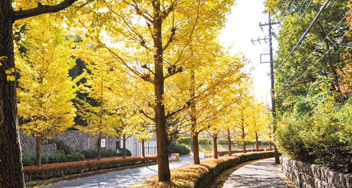 また、松蔭大学沿いの森の里・学園研究区緑化協定区域には、イチョウの木が並び=写真下=、黄色のじゅうたんができている。周辺の若宮公園ではもみじが赤く色づき、写真を撮る人の姿も多く見られる。