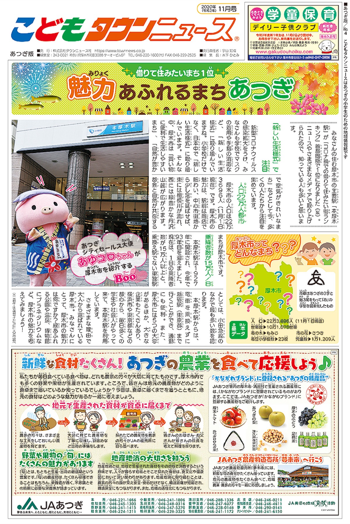 厚木・愛川・清川編集室では、厚木市内の公立小学校全児童に配布する「こどもタウンニュースあつぎ版11月号」を11月27日に発行しました。テーマは「魅力あふれるまち・あつぎ」です。
