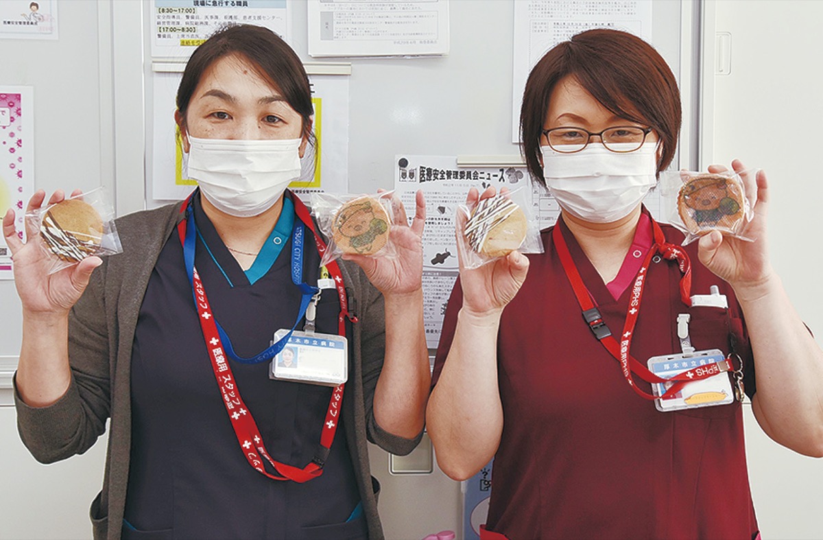 厚木市旭町のケーキ店「ツリーオーブン」のオーナーシェフ・岡田裕樹さんと堀口豊さんが11月18日、厚木市立病院(長谷川節院長)を訪れ、クッキーやチーズパイ、あゆコロバターカステラなど500個を寄贈した=写真。