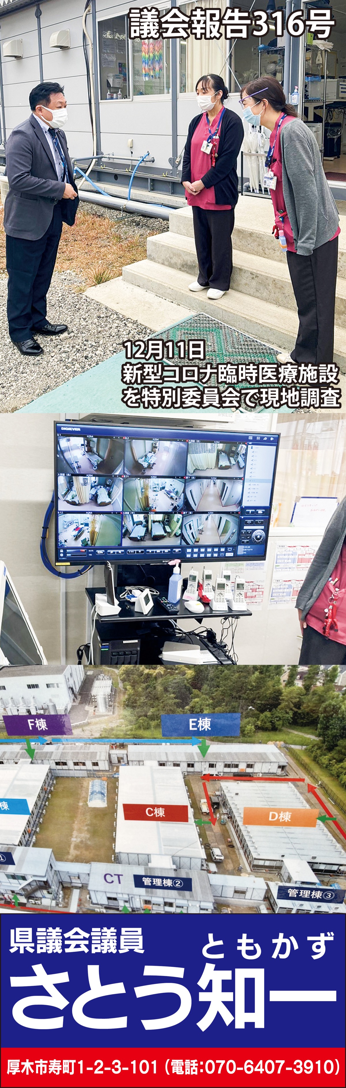 12月11日、新型コロナウイルス感染症対策特別委員会に委員として出席し、審議に臨みました。午後は中等症患者を対象とした県の臨時医療施設視察(現地調査)に参りました。新型コロナ対策の最前線で、治療・看護にあたる医師や看護師といった医療従事者の皆様から直接、生の声を伺い対応を約束しました。