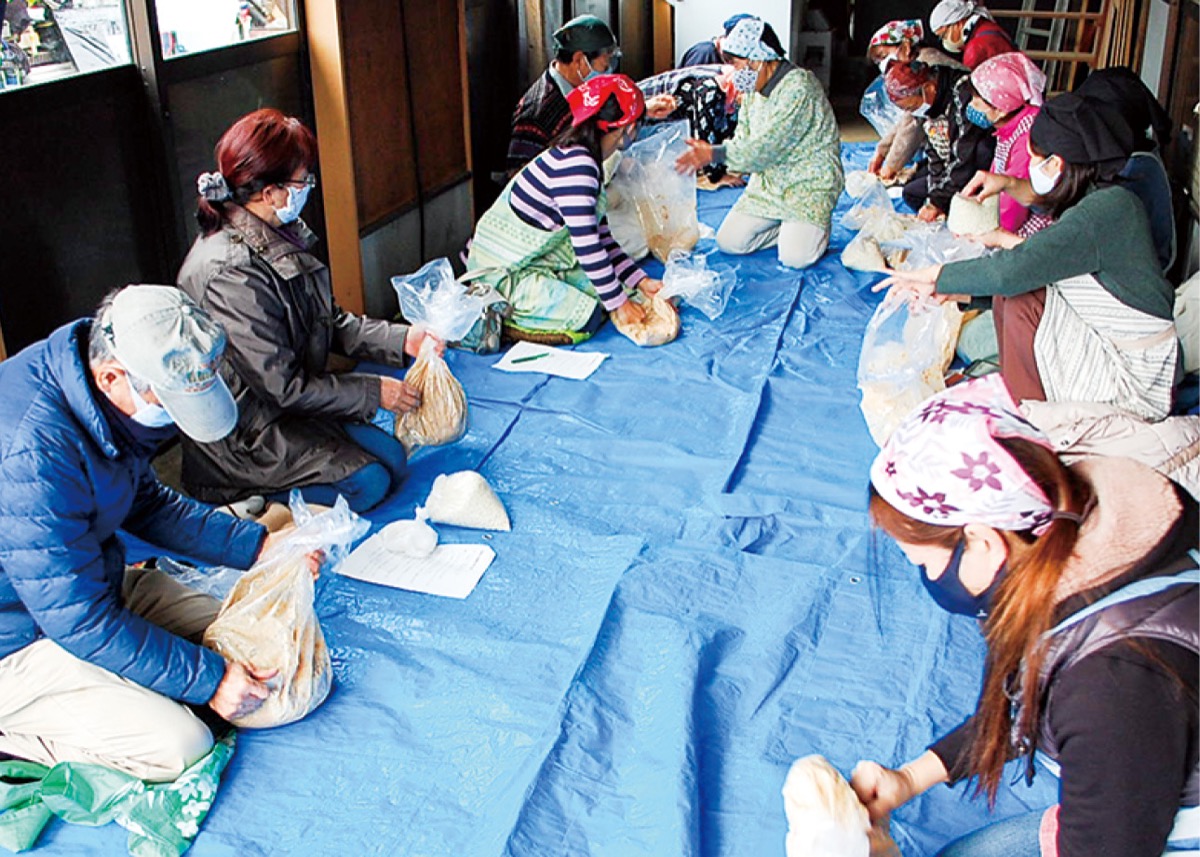 当日は同公民館近くの講師を務めた臼井スミ子さん宅の敷地内で実施。参加者らは、大豆を煮て冷まし、米麹と塩を混ぜミンチするなどして味噌をつくり容器に詰めた。