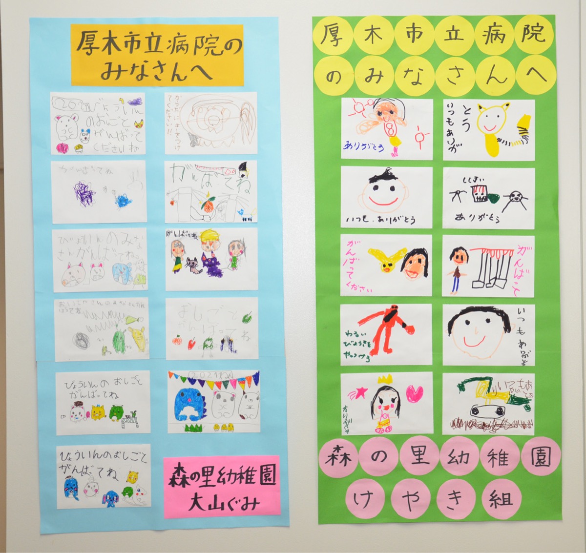 新型コロナウイルス感染症への対応など、現場の最前線で奮闘する医療従事者に感謝の想いを伝えたいと、学校法人なかい学園森の里幼稚園(厚木市森の里)とNPO法人マイルストン・カルチャークラブ マイルストン学童クラブ(厚木市上古沢)の子どもたちが、メッセージを集めた掲示物を寄贈した。