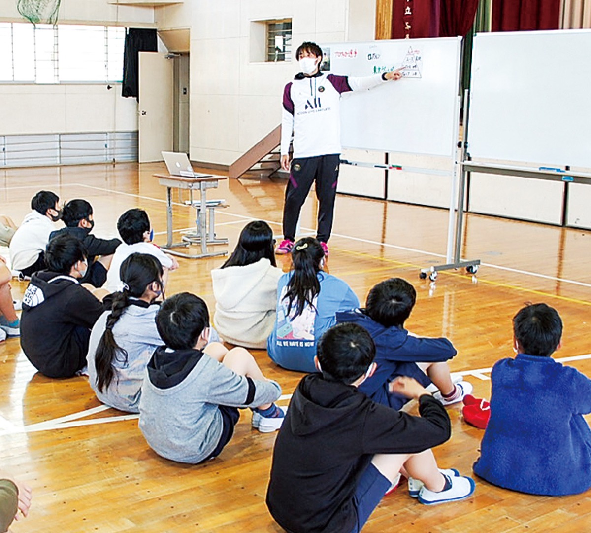 総合的な学習の時間の中で6年生55人とサッカーボール等を使った簡単なトレーニングを実施したあと、自分の夢だったプロサッカー選手になるまでの道のりや心情などを体験談を交え話し、「夢に向かい失敗を恐れずにどんどんチャレンジしていってほしい」と説いた。