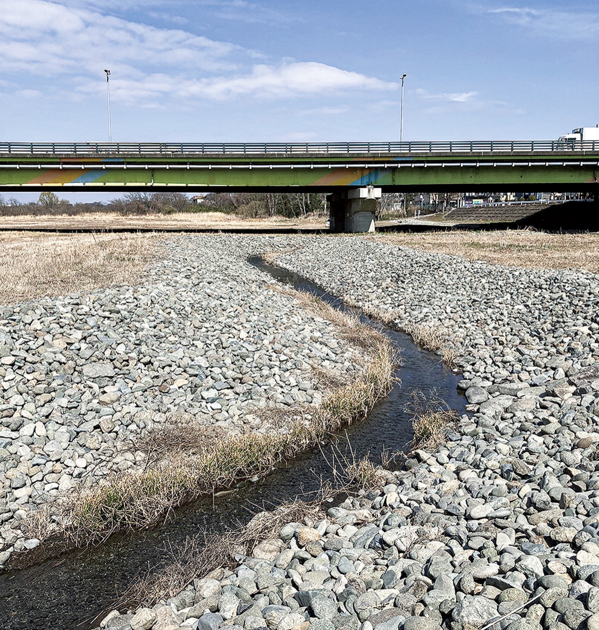 中津川の河川敷、金田陸橋下を通る金田水路が改修され、2月末に新しいビオトープが完成した。河川敷の清掃活動などを行っている金田まちなみ推進委員会では「生物共生の場所として活用していきたい」と期待する。