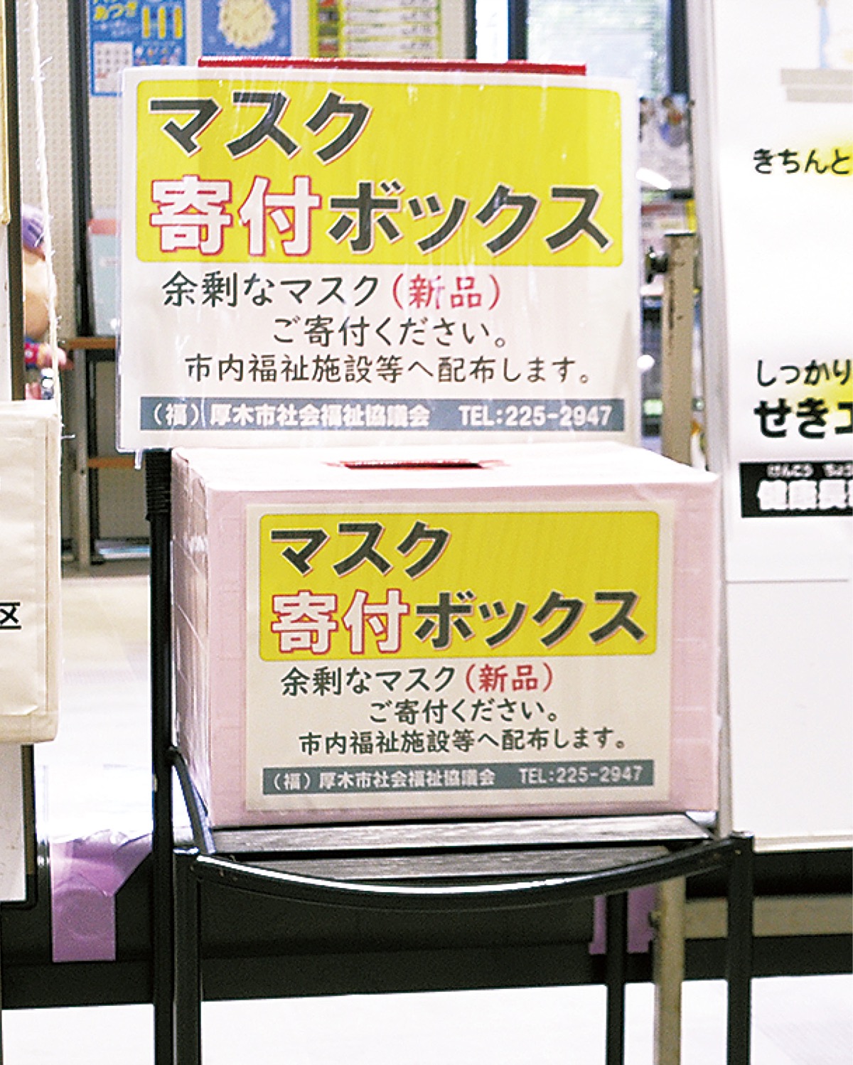 社会福祉法人厚木市社会福祉協議会(神保忠男会長)が、昨年6月から厚木市保健福祉センターのエントランスに設置していた「マスク寄付ボックス」。開始当初に比べ、品薄になっていたマスクも安価で入手できるようになったことや、緊急事態宣言が解除されたことから、3月31日に設置を終了した。