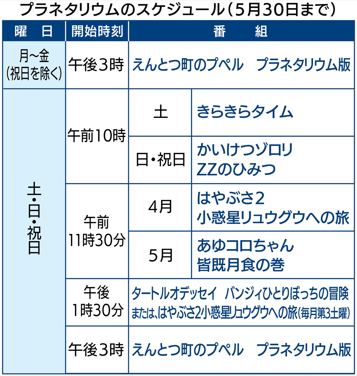 プログラムは土曜、日曜、祝日の午前10時からで、土曜は星空を楽しむ「きらきらタイム〜おほしさまの巻〜」、日曜と祝日は「かいけつゾロリZZ(ダブルゼット)のひみつ」を観賞できる。