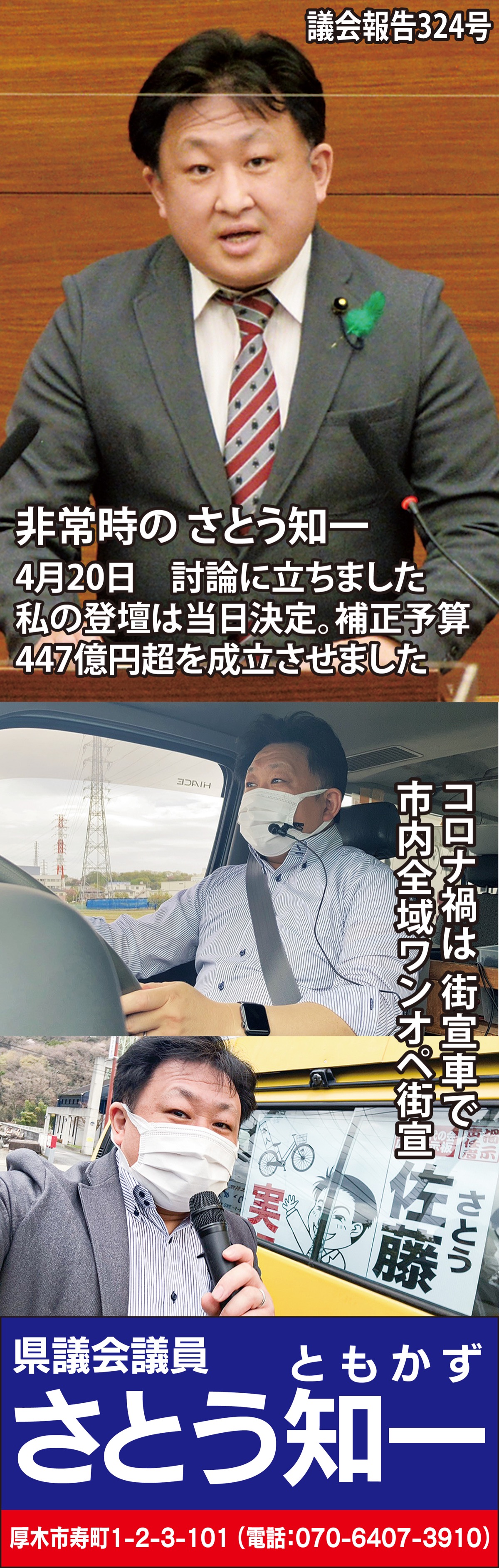 平日毎朝、行っていた早朝議会報告もコロナ禍となり、自粛しています。代わりに街宣車を用いての日中「御用聞き街宣」をソーシャルディスタンス形式で行っています。
