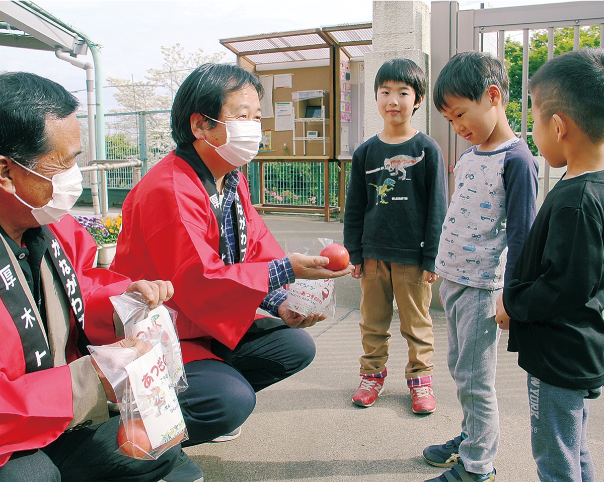 同部会では、マイロックを主な栽培品種として、年間約300トンのトマトを生産。子どもたちに「食農」について学んでもらい、厚木産トマトの美味しさを知ってもらおうと、毎年、市内保育所に寄贈する。当日は古郡部会長らが子どもたちにトマトを手渡した。