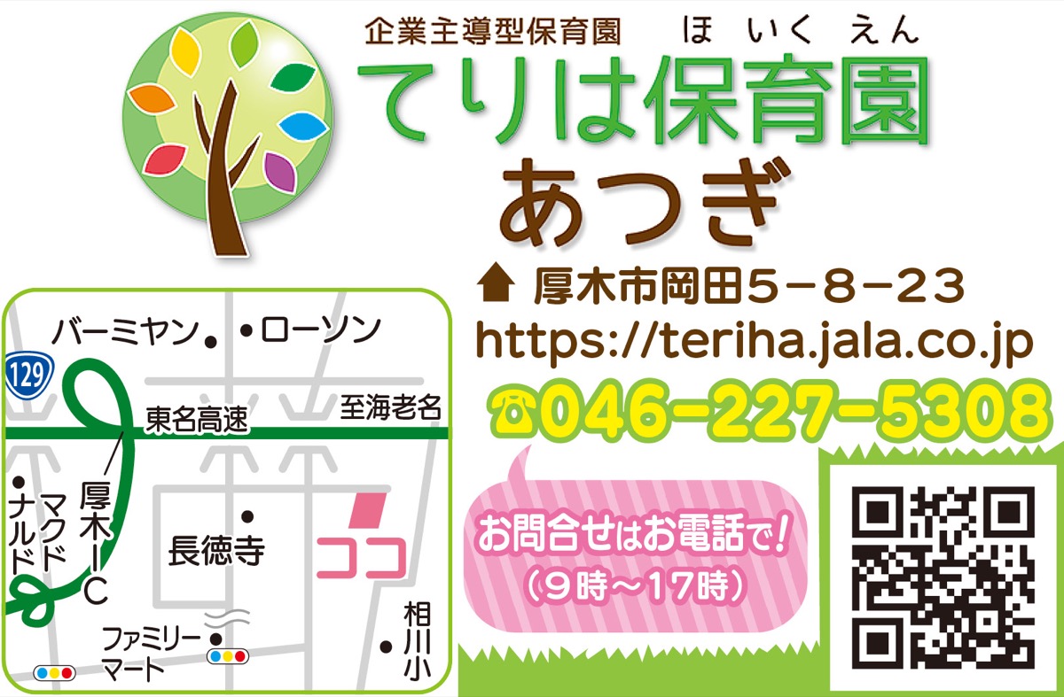 「私たちは働くママ・パパを応援します」を掲げるのは、6月1日に厚木市岡田に開園する「てりは保育園」。「企業主導型保育園として認可保育園と同等、それ以上の高い水準で運営する」という言葉の通り、先に開園した川崎市では好評を博している。