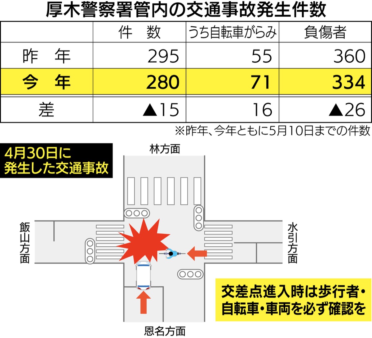 厚木警察署管内(厚木市、愛川町、清川村)の今年5月10日までの交通事故発生件数は280件。昨年同時期に比べて15件減少している。そのうち自転車が関係する事故は71件。昨年同時期と比較すると16件増加している。「全体の件数が減る中で自転車がらみの事故はかなり増えている」と同署。今年3月までのデータを見ると、事故の発生場所で一番多いのは交差点。なかでも自転車が右折、もしくは右折してきた自動車などに衝突する事故が一番多い。