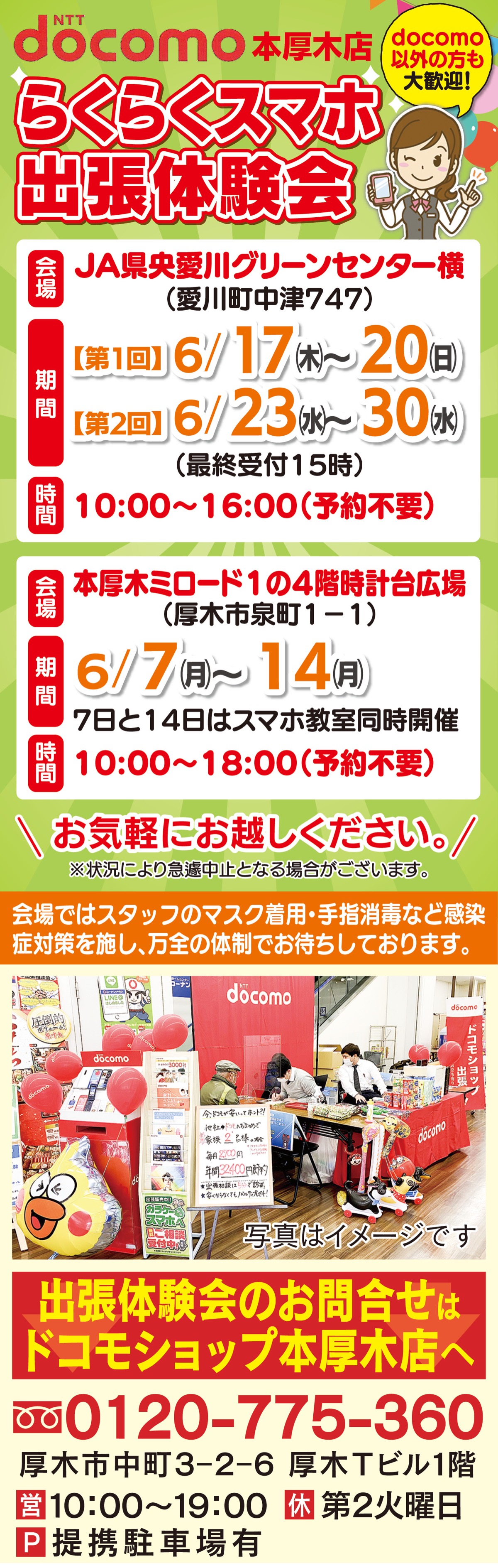 ドコモショップ本厚木店は、「丁寧で分かりやすい」と好評の『らくらくスマートフォン出張体験会』をJA県央愛川グリーンセンター横と本厚木ミロード1の4階時計台広場で開催する。