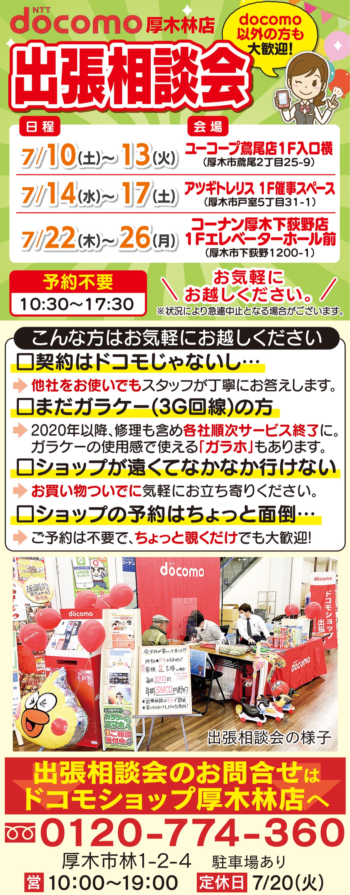 「毎月の料金が高い」「機種変更したい」など、携帯電話やスマホに関する悩みがある方に朗報!ドコモショップ厚木林店は、ユーコープ鳶尾店とアツギトレリス、コーナン下荻野店で好評の出張相談会を実施する(日程は左記参照)。