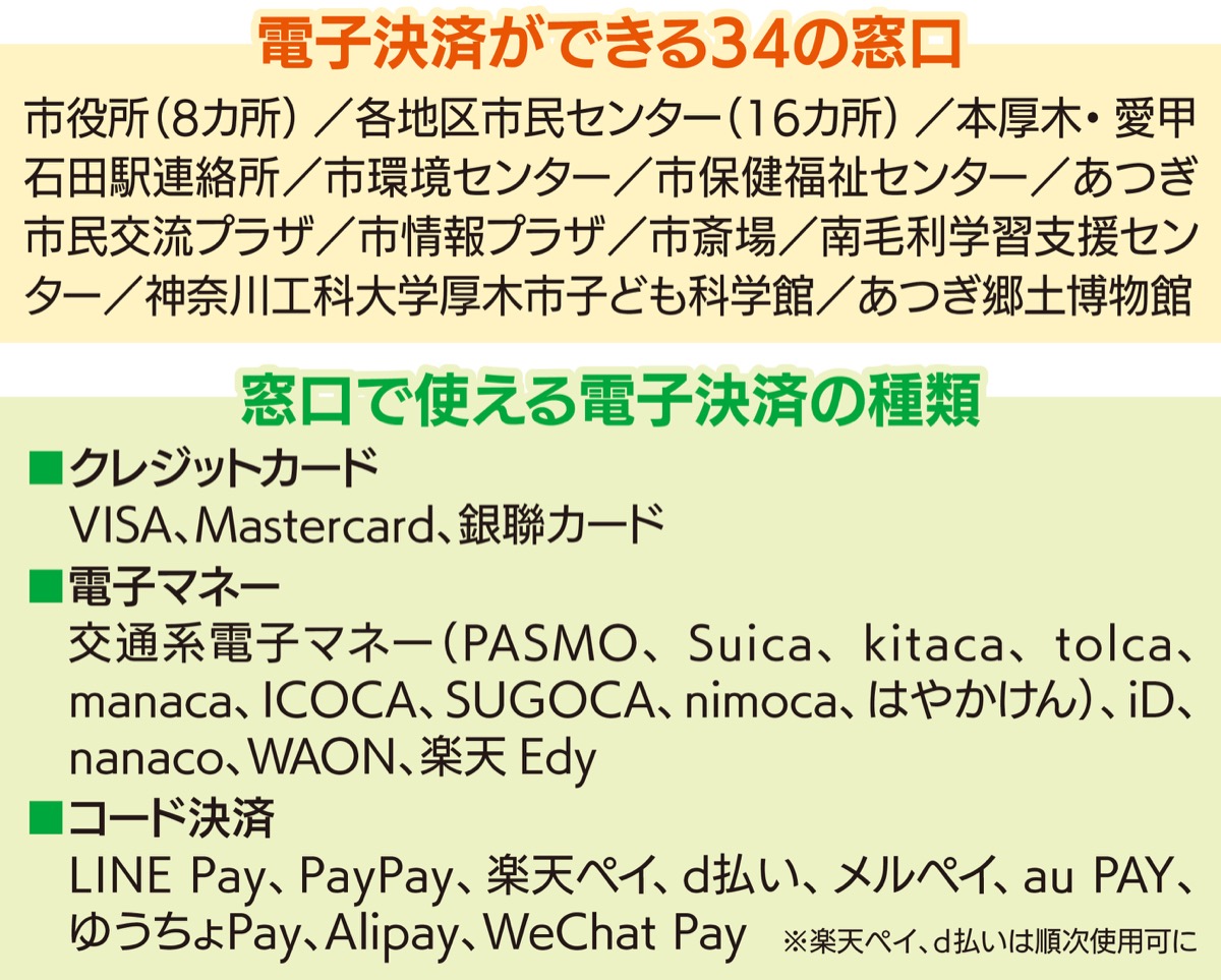 電子決済の支払いが可能なのは、市が発行する各種証明書の手数料のほかに、粗大ごみの処理手数料(厚木市環境センター)、火葬料・使用料(市斎場)など。使える電子決済の種類はクレジットカード、電子マネー、スマートフォンをかざして使うコード決済(表参照)。現金での支払いは引き続き可能。また、スポーツ施設の利用料などについては、「券売機の更新時期など今回はタイミングが合わなかった」とし、「できる限りキャッシュレス化を進めたい」と話す。