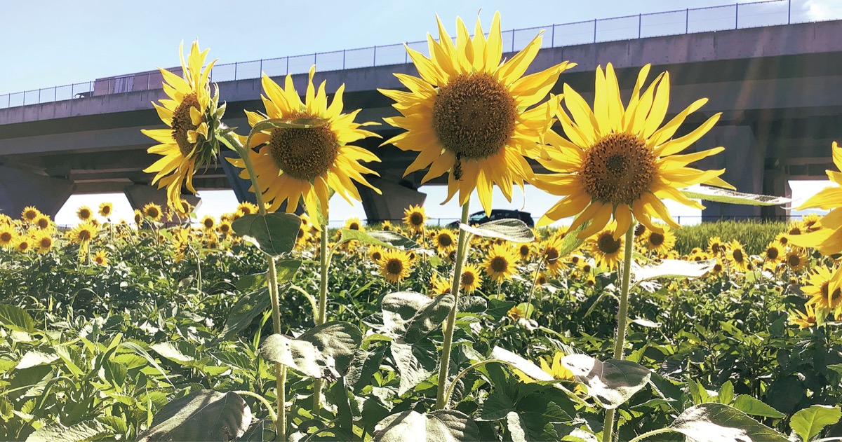 約3000平方メートルの敷地に咲く鮮やかなひまわりは、地域住民による組織・フラワーパーク下依知実行委員会が約10年前から毎年育てているもの。昨年は、新型コロナウイルス感染症の影響で種蒔きが遅れたため、開花が8月にずれこんだが、今年は種蒔きも例年通りのスケジュールで行われ、7月中旬から下旬にかけて満開を迎えた。