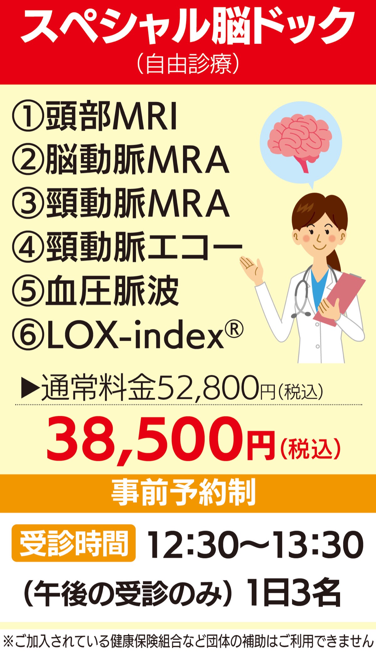 事前予約制。費用は38500円(受診時間12時半〜13時半、午後の受診のみ)。また腫瘍マーカーやMCIスクリーニング等の当日申し込みも可能。同院では「脳の病気は早期発見・治療が重要となります。この機会に新しい検査をうけてみては」と話す。