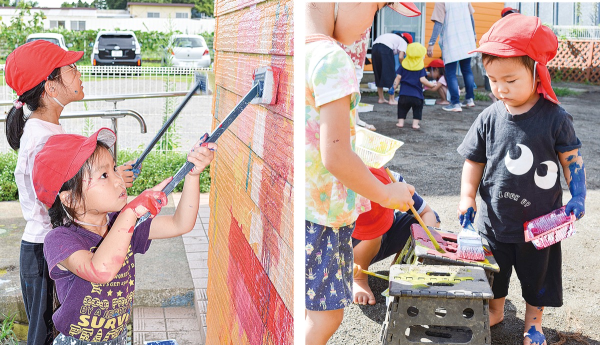 この活動は、子供たちの自由な発想を育もうと定期的に開かれているイベントの一つ。園舎や遊具など施設全体をキャンパスに見立て、どこでも自由に描けるとあって園児に人気という。