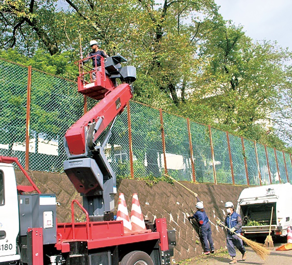 この日は同社の社員約20人が整備にあたった。村内の緑小学校、緑中学校、宮ヶ瀬小・中学校、清川幼稚園で伸びた雑草を刈払い機で丁寧に整備したほか、高所作業車も用意され、普段は手入れが難しい高い木の剪定なども行われた。