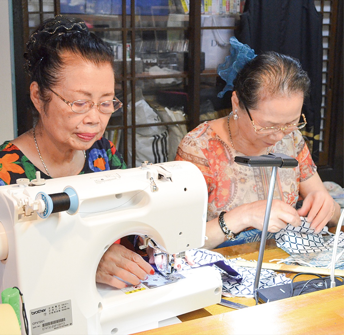 普段であれば、14人が座れる店内のカウンター席は、ミシンと色鮮やかな生地が並び、マスク作りの作業場に。ミシンを操るのはママの伊藤紀子さん(80)で、耳紐を通すのは常連客の大崎三枝子さん(82)。「気持ちよく使って欲しい」と一枚ずつ袋詰めもする徹底ぶりで、息の合った作業で次々と仕立てていく。