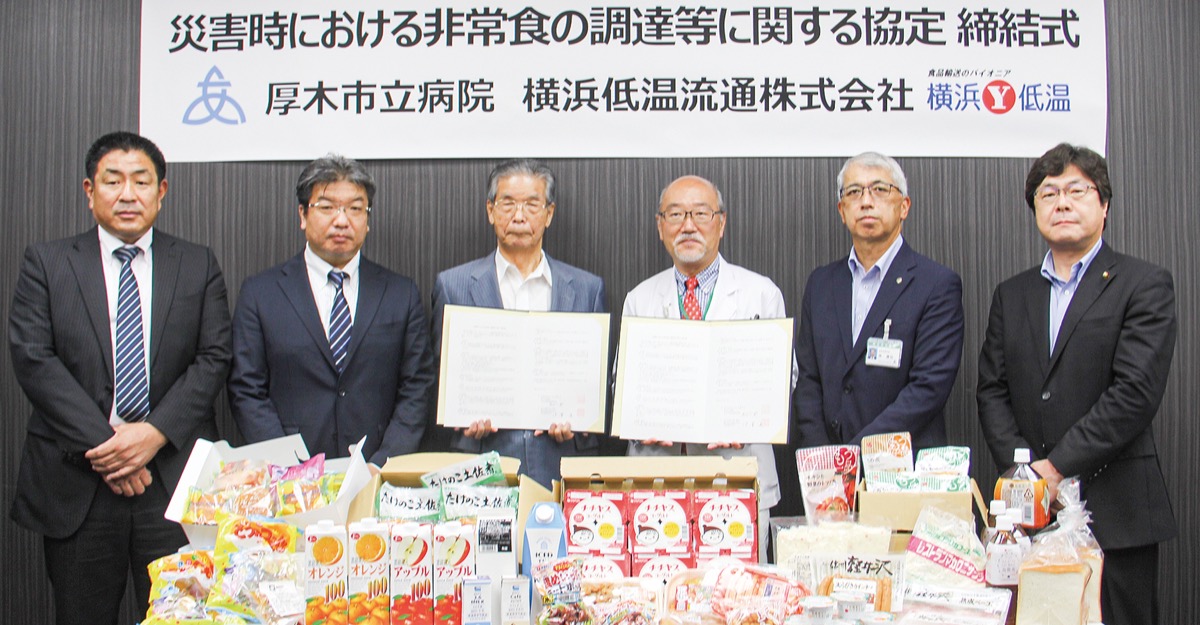 横浜低温流通株式会社(伊澤進代表取締社長/厚木市酒井)と厚木市立病院(長谷川節病院長/厚木市水引)は9月9日、「災害時における非常食の調達等に関する協定」の締結式を同病院で行った=写真。