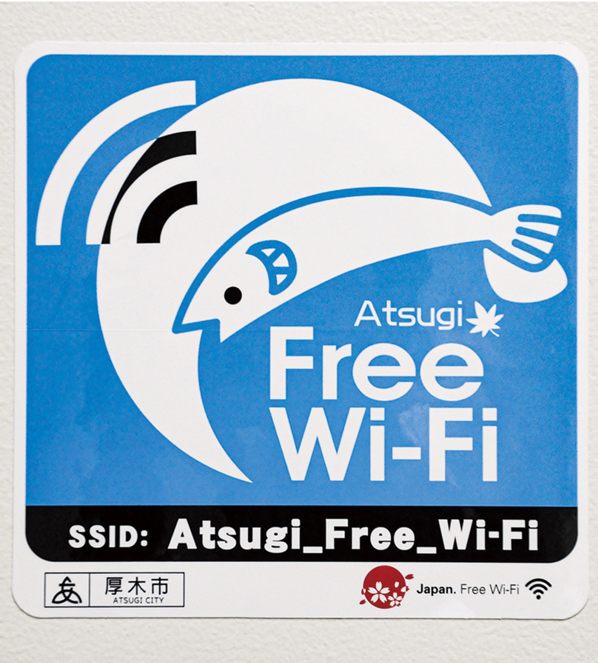 Wi-Fiの利用可能場所には、専用のマーク=写真=を掲示している。利用方法は、スマートフォンなどのWi-Fi設定で「Atsugi Free Wi-Fi」を選択。その後、Eメールアドレスの登録、またはソーシャルネットワークサービスからログインし、注意事項に同意すると接続できる。利用方法や利用可能エリアは厚木市のホームページから確認できる。