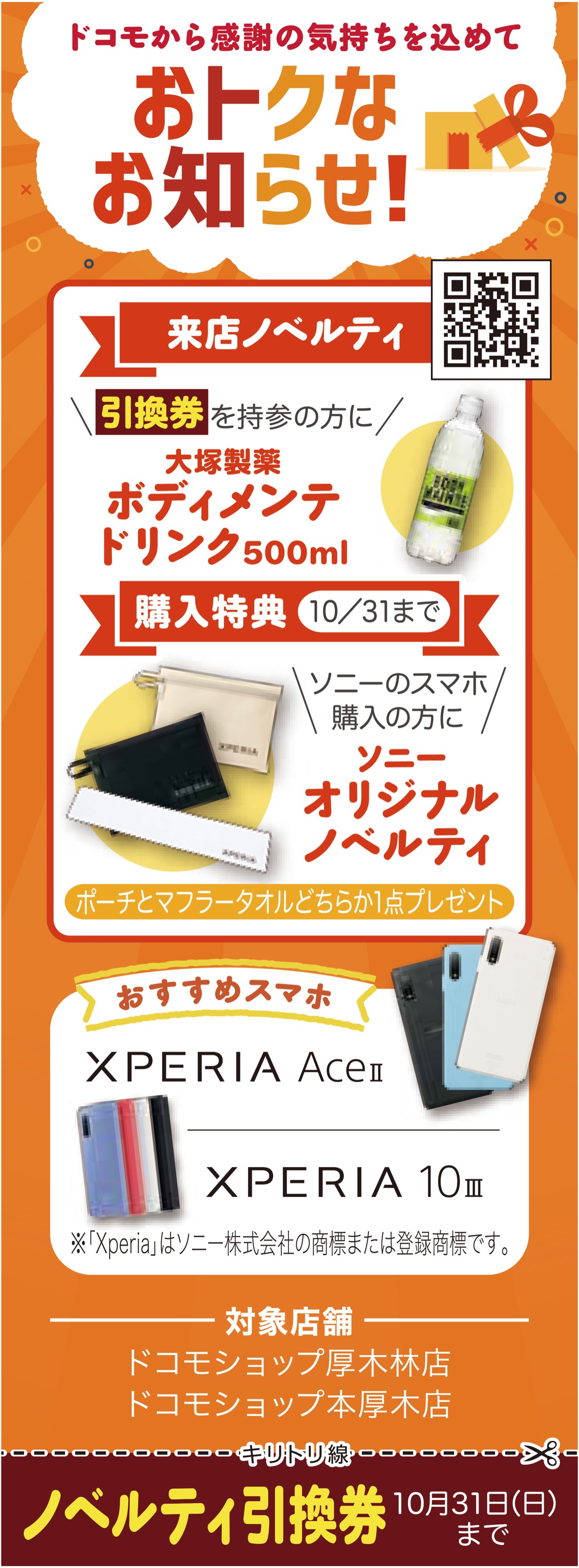 NTTドコモでは、長年利用しているシニアユーザーへ日ごろの感謝を込めて10月31日(日)までソニーの新作機種の購入で素敵なポーチかマフラータオルのどちらか1点をプレゼント中。シンプルな機能に劣化しにくいバッテリーを搭載したエクスペリアAceIIと、写真や音楽がたっぷり楽しめる10IIIの今、おすすめの2機種が対象。また期間中は来店すると乳酸菌で体調管理をサポートするボディメンテドリンク(500ml1本)もプレゼント。